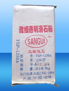 硅酸镁,分子式为3MgO·4SiO2·H2O。 滑石属单斜晶系。晶体呈假六方或菱形的片状。滑石微粉是由滑石块经多道工序研磨加工制成,为白色粉末,有滑腻感,具有润滑性、耐火性、抗酸性、绝缘性、熔 点高、化学性不活泼、吸附力强等优良的物理、化学特性。TSP型微细滑石粉采用广西桂林市特级滑石矿,经过筛选、精洗、烘干、研磨、分级等一系列严密工序 精制而成.该产品具有色相好,透明度好,悬浮性优等特点,粒度分布均匀,吸油量中等。广泛应用于涂料、塑料、电缆、油墨及造纸,在其他行业中应用也可以改 善产品的综合性能,提高生产效率,降低生产成本,经国内多家大中型化工涂料生产企业使用后获得了良好的评价和经济效益。