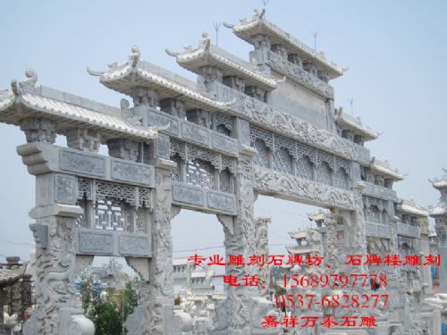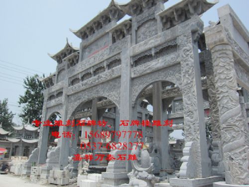 厂家。 山东嘉祥万泰石雕厂是嘉祥集石雕设计、创作石牌坊、石牌楼于一体的大型石牌坊制作厂家,设计各种石牌坊、石牌楼、加工、销售的石雕厂家。常年提供石牌坊,石牌楼,价格低做工好。联系地址:山东省济宁市嘉祥县石雕城 联系人:韩运波 联系电话:15689797778