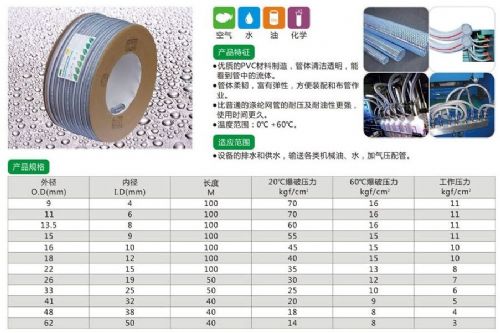 采用高透明度,无味的PVC材料制造,质量稳定,承受的气压更高.清洁透明,富有柔软性.外层增加红,蓝,白三条线,使管的外观更加雅观.用于输送各类机械的油,水,气.如
