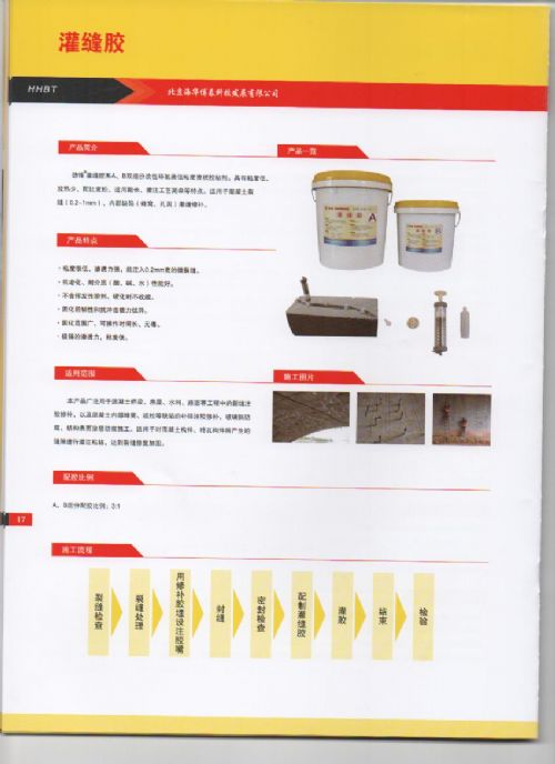 。具有粘度低、放热少、配比宽松、适用期长、灌注工艺简单等特点。适用于混凝土 裂缝 (0.2-1mm)、内部缺陷 (蜂窝、空洞)灌缝修补。