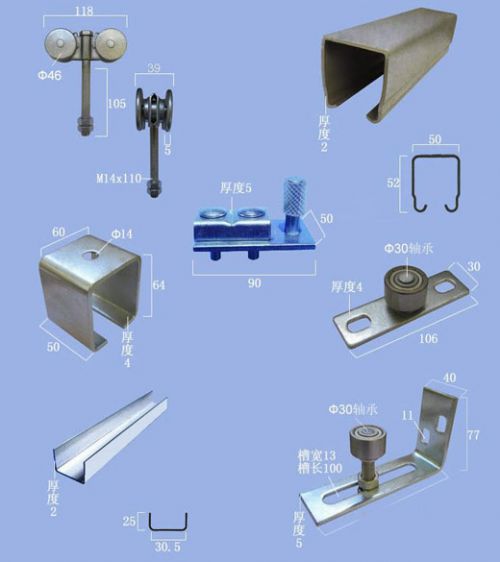 ,吊轨挂件,吊件,门档,50系列门边,75系列门边,下导轮,下导轨等一些列配件,让门体制作安装更加快捷,方便,维修维护也更加轻松,有效提高制作安装速度。