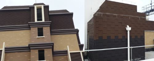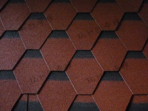 马赛克效果,用马赛克型铺盖的建筑整体感觉新颖,独特,极为美观,并且马赛克型背面自粘胶是全被胶,增强了屋面的防水及抗风性能。