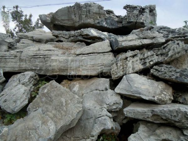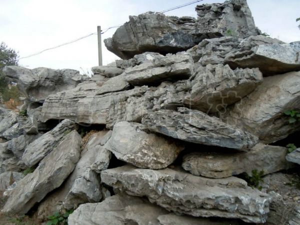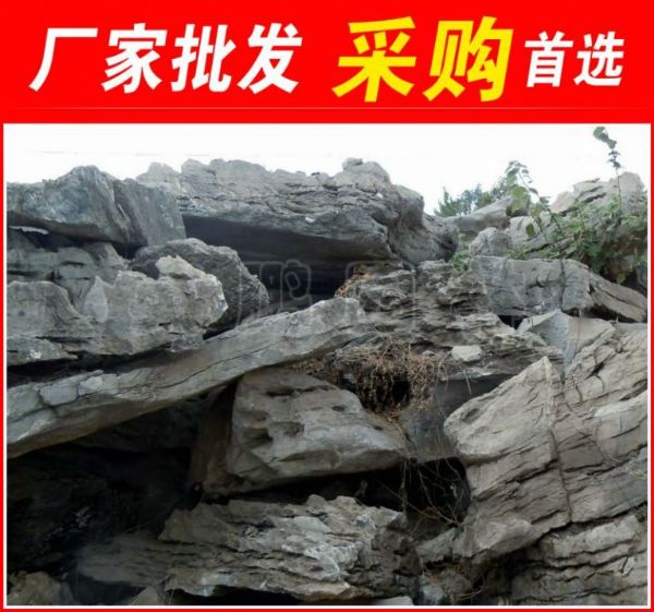 英石系石灰岩。外表锋棱突兀,多见黑色,间有青色、白色,并时见白石筋,扣之有声。又分阴石、阳石两种。阳石是表露于外的,具有瘦、皱的特点,按其特征又分为直纹石、横纹石、大花石、小花石、叠石和雨点石等。花石中含有白筋;阴石系埋没于土中,具有漏、透的特点,类似于