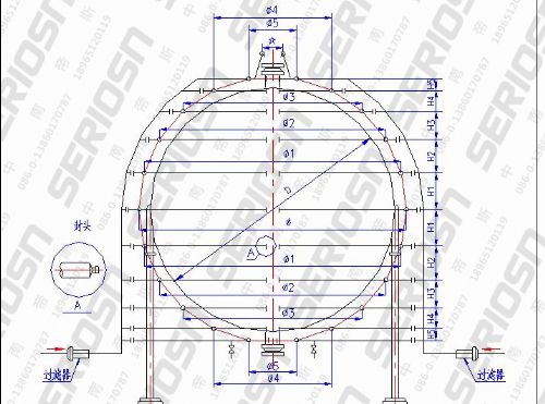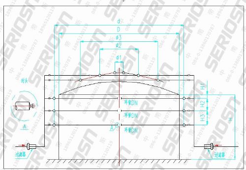 法兰盘与供水管相连接的数个围贮罐一周水平设置的环管,在各环管的下面均布有喷头,其装配于上部环管上的喷头为喷射口朝向贮罐的水幕喷头,装配于下部环管上的喷头为喷射口平行罐侧壁向下的水幕喷头。油罐利用SPTM水幕喷头在罐体的表面形成均匀的水幕,使罐内的易燃易爆物迅速得到降温,而利用水幕喷头形成环绕罐体的均匀水幕,有效隔离火源和防止辐射热传导,可满足高等级防火贮罐的消防要求。