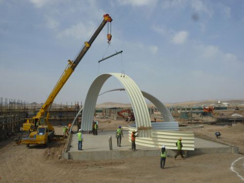 先进的施工方法,科学的设计构思使彩板拱形建筑的整体构造与节点连接合理,精确。一台设备每天可完成彩板拱形屋面工程1000平方米以上。