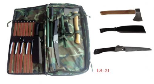 多采用新型设计,工具包采用涤纶涂层织物,防水性强,工具由:砍刀、锯、斧头、锹、扑火拍、五齿耙、连接杆、工具背包共九件组成,连接杆可与锹、扑火拍、五齿耙任意连接,携带方便,多种用途。
