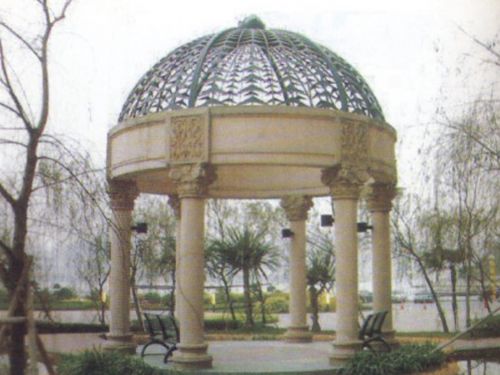 凉亭。凉亭形状都是小巧玲珑,四面敞开,通风透光,是供游人休息和观景的一种园林建筑。凉亭的特点是周围开敞,在造型上相对的小而集中,因此,凉亭常与山、水、绿化结合起来组景,我国古典园林中的凉亭,特别讲究装饰,可起点缀园景和建立观景点的作用。
