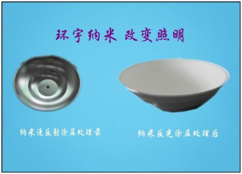 反光罩/反射罩进行表面处理,比如阳极氧化、电镀、贴反光纸/膜等,用以提高照明设备/装置的反射率,提高光效,但是,这些传统的表面处理方法,很大程度限制了照明灯具的光输出率(电镀的全反射率90%左右,阳极氧化的全反射率50%左右)。纳米漫反射材料在照料中的应用,为照明反光材料提供了一种新选择!