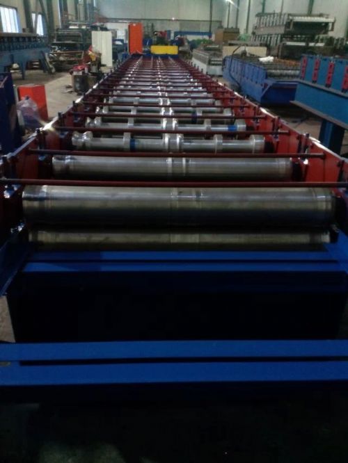 是更新传统屋面成型机的产品,该机主要由装料架,装料架支座,进料导入平台,成型主机,成型剪切装置,