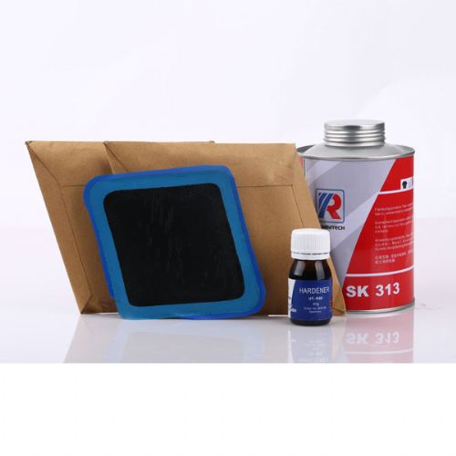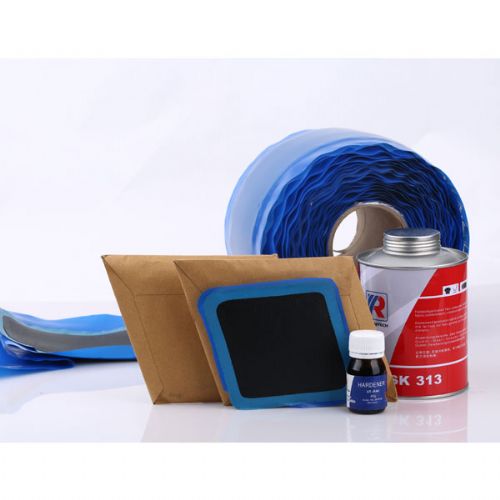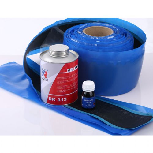冷硫化粘接剂,待其完全干燥。破损面涂刷第二遍SK313冷硫化粘接,修补条带半硫化层面也同时涂刷一遍SK313冷硫化粘接剂,两者待其似干非干(胶液不附着在指背)即可开始粘接。