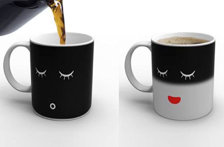 1.无热水前,杯子黑色/蓝色/红色/绿色,加热水后,杯子变成白色,同时你所印的图案也显示出来,水变凉照片慢慢隐去