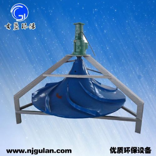 G/QSJ 型系列曲面搅拌机曲面叶轮体上表面为双曲线母线绕叶轮体轴线旋转形成的双曲面结构,其独特的叶轮结构设计,*大限度地将流体特性与机械运动相结合。双曲线的方程为xy=b 曲线沿y 轴旋转而构成的曲面体;为了迎合水体流动,设计从叶轮的中心进水,这一方面减少了进水紊流,另一方面保证了液体对叶轮表面的压力均匀,从而保证整机在运动状态下的平衡。在渐开双弧面上均布有八条导流叶片,借助液体自重压力作补充进水获得的势能与叶轮旋转时产生的离心力形成动能,液体在重力加速度的作用下经双曲面结构过渡沿叶轮圆周方向作切线运动,在池壁的反射作用下,形成自上而下地循环水流,故可获得在轴向(y)和径向(x)方向的交叉水流(如双曲面流态图)。正是由于G/QSJ 型系列曲面搅拌机叶轮的结构特性和接近池底安装的特点,其工作位置决定了它对悬浮物的防沉降作用是直接的,在工作中可获得理想的搅拌效果,能有效地消除搅拌死角。较大的比表面积可获得大面积的水体交换。