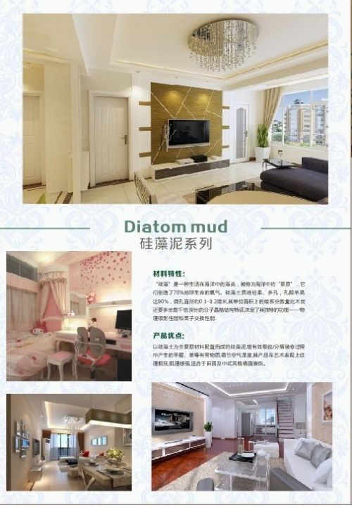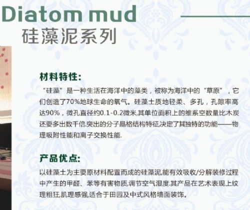 装修过程中产生的甲醛、苯等有害物质,调节空气湿度。其产品在艺术表现上纹理粗犷、肌理感强、适合于田园及中欧式风格墙面装饰。