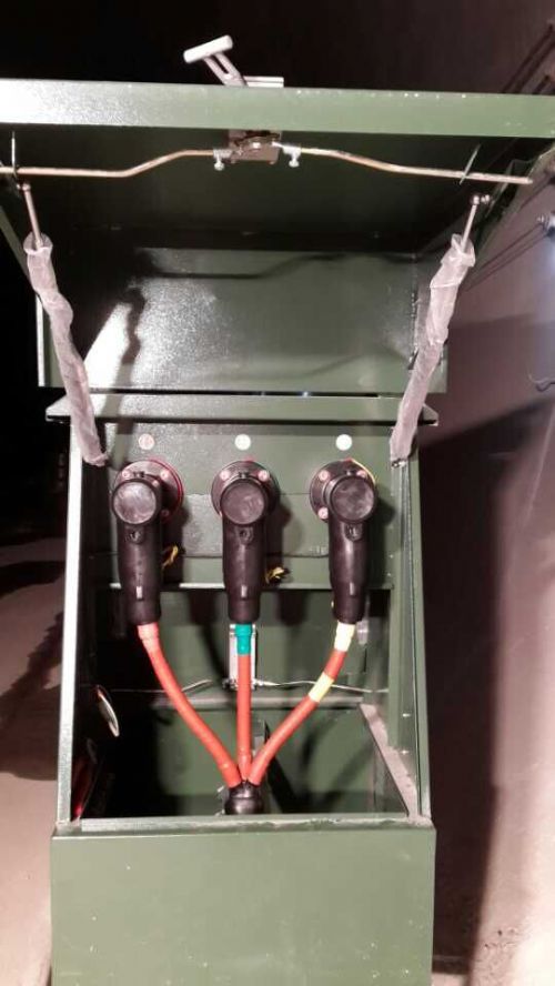 高级分接箱内含有开关设备,既可起普通分接箱的分接、分支作用,又可起供电电路的控制、转换以及改变运行方式的作用。开关断口大致将电缆回路分隔为进线侧和出线侧,两侧电位可以不一样。开关设备本身有较大的体积,因此高级分接箱的外形尺寸比较大,高度一般为1.4~1.8 m,深度约为0.9~1.0 m,长度则依所含开关设备数目而定,多在1.0 m至2.4 m之间。箱体的外形类似于户外箱式