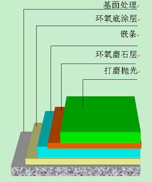 环氧磨石层:用环氧磨石涂料拌彩色骨料抹刮。