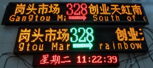 3、公交线路LED显示屏显示方式:左右移动、上下移动、左拉幕、右拉幕、中开合、闪烁、即显等共二十余种方式。