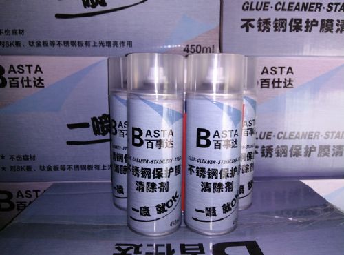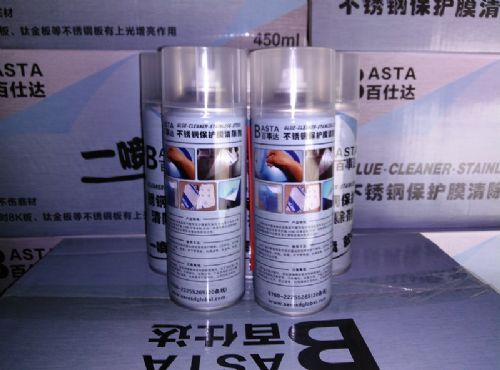 先擦去不锈钢表面胶纸的灰尘,用本品对需要脱落的胶纸喷射,五分钟到十分钟后,胶纸表面开始起泡,脱落。对不锈