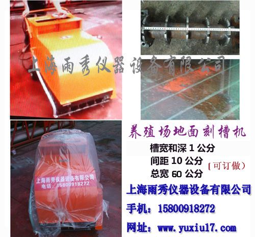 养殖场*地面刻槽机为我公司(上海雨秀仪器设备有限公司 原上海雨秀仪器设备厂)*新研制开发的一款高性能产品,该款刻槽机主要适用于养殖场、奶牛场、牛棚、牧业等各类混凝土地面、广场、室内刻制防滑纹(兼散水纹)的一款新型机器。该刻纹机槽纹深度可按客户需要订制成槽宽1-1.5公分宽和深不等,纹理排列有序、槽纹表面清晰美观、操作便捷,是养殖业针对地面防滑的一款新型机械。