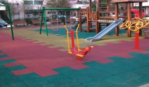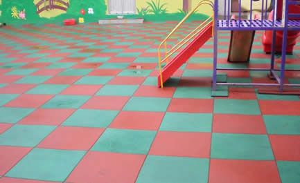 地砖由两层不同密度的材料构成,彩色面层采用细胶粉或细胶丝并经过特殊工艺着色,底层则采用粗胶粉或胶粒、胶丝制成。