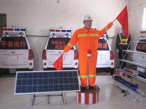 产品两只手均拿小旗,可上下摆动,警灯可闪烁。