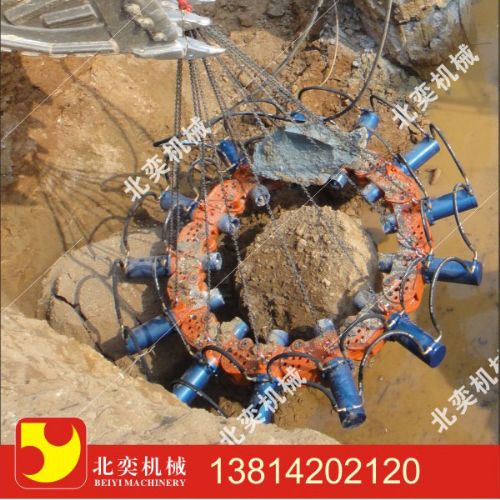 油缸提供压力,油缸直接驱动钎杆,同时挤压桩身,使桩头截除。截桩机施工过程中,操作简单,低噪音,低成本,适用于桩群施工工程中。截桩机采用模块化组合,通过销轴联接模块,可以通过不同模块数量组合,截除一定范围内直径桩头。