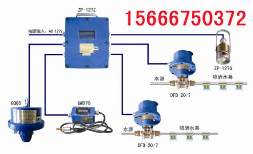 球阀组成,皮带机有煤流时该装置开启防尘水幕进行机头及机路防尘,无煤流时自动关闭防尘水暮。同时利用温度、烟雾传感器监控环境及隐患区域中的火情和空气温度,当有发生火迹现象时,自动开启水暮进行灭火,直到火情解除便自动关闭水暮。也可根据现场实情设置定时开关水暮。