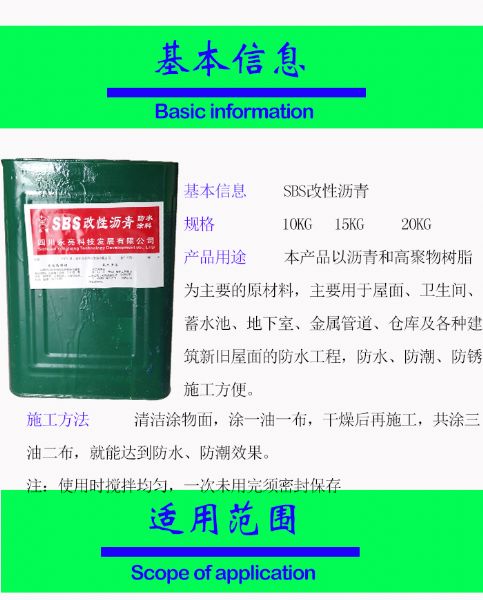 本产品以沥青和高聚物树脂为主要的原材料,主要用于屋面、卫生间、蓄水池、地下室、金属
