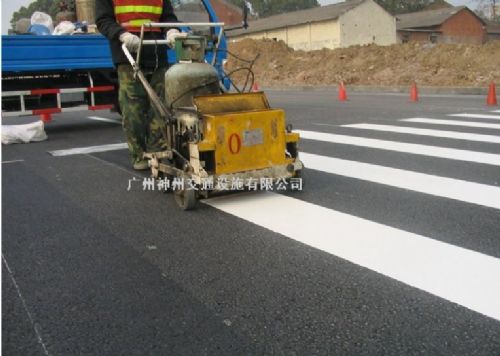 4、涂敷。材料熔融后,按着放样的线路摆好机械,推动机械时打开阀门,将熔融的热熔涂料流出,同时通过自重式玻璃珠撒布器撒布在涂膜上。