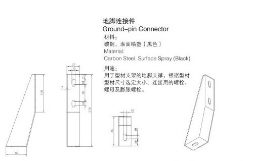 碳钢,表面喷塑黑色,用于型材支架的地脚支撑,根据型材尺寸选定大小,连接用的
