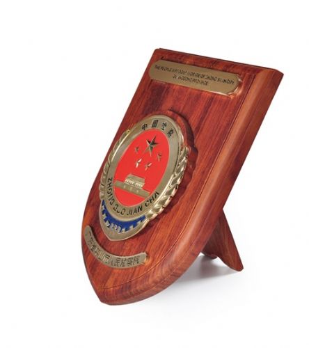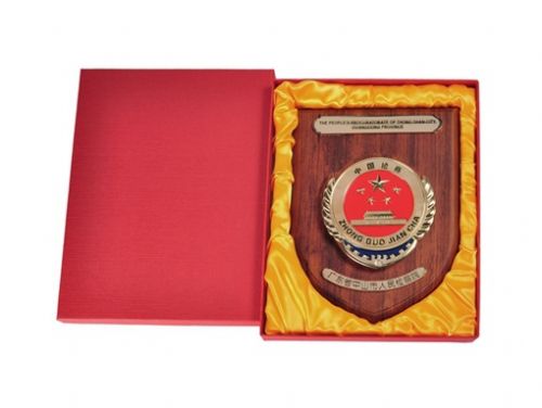 的木盒全部用进口红木制作,产品规格220*160*30MM,产品由一块盾形红木板+支撑脚组成,木板表面镶上有纪念意义的贵金属奖章,沉甸甸的份量不由得想起民国时期的“青天白日章”,满满的荣誉非常值得珍藏。用黄色内衬+红色礼盒包装,显得更加的高档名贵。