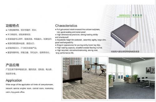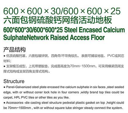 活动地板采用优质的硫酸钙基,六面包镀锌钢,四角带/不带角锁孔,表面可铺设地板、PVC或其他材料。支架模压成型,上托戴塑胶垫,完成面高度为70mm-1500mm,可采用横梁四周支撑式结构或支架四角支撑式结构。广泛应用于各种电脑机房,通讯机房,控制室,电力房,高级写字楼。