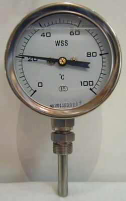是基于绕制成环性弯曲状的双金属片组成。一端受热膨胀时,带动指针旋转,工作仪表便显示出所应的温度值,并且防止环境振动在温度计内部充装