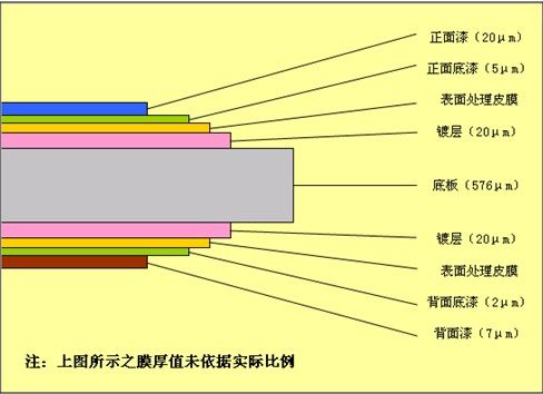 采用高耐久性之聚酯涂料(High-durability Polyester,简称HDP)为上涂层(Topcoat)之双面二涂二烤(2C2B)制程生产。一般的环境下其耐用年限可达15年之久。