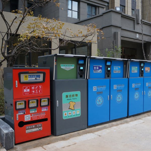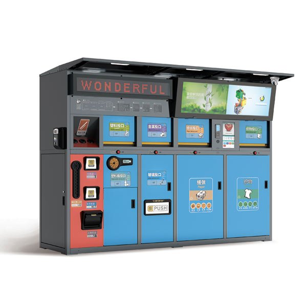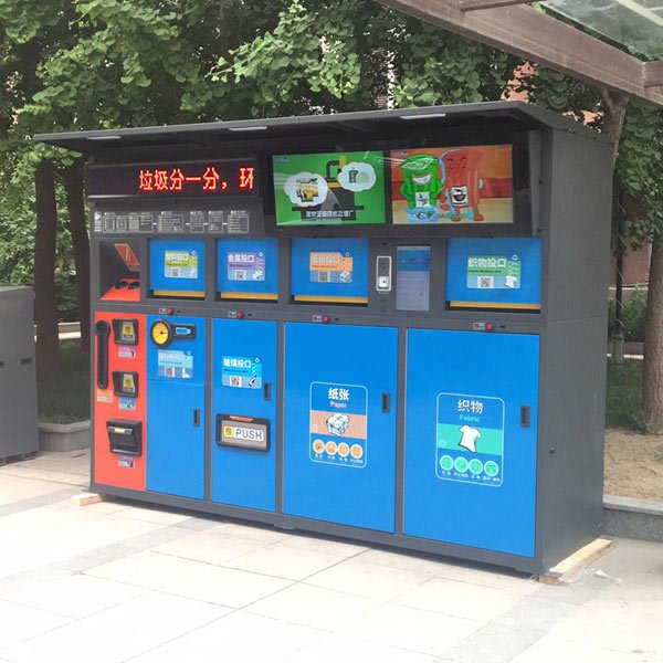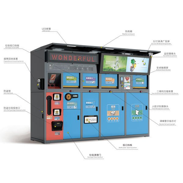 此款智能设备将全新的设计理念和ling先科技完美结合,精致时尚的外观设计,十分具有科技感,色彩搭配巧妙,分类标识设计简洁醒目。蓝色箱体主要收集织物、纸张、金属、玻璃、塑料、塑料瓶等六种可回收物;红色箱体用来收集有害垃圾,箱体上巧妙设计多种投口,将有害垃圾分别回收。此款设备的亮点是用户可通过安卓触摸屏进行“人像采集”注册个人账户,在后期分类投递垃圾时可直接通过“