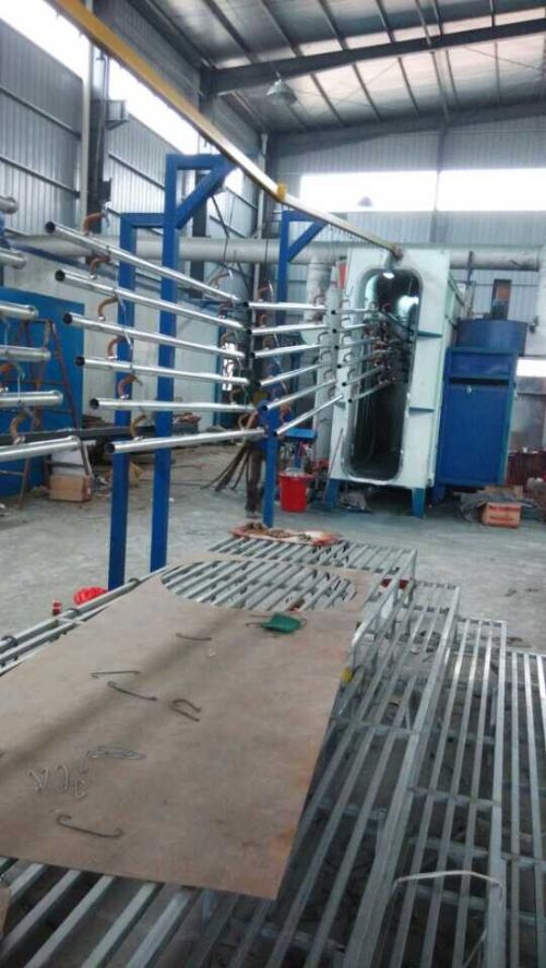 挂钩部分,在进入固化之前,应尽可能将附着其上的粉末吹掉,防止挂钩上之多余粉末固化,有的对固化前去掉余粉确有困难时,应及时剥离挂钩上已固化之粉膜,从而确保挂钩导电良好,以利下批工件易于着粉。