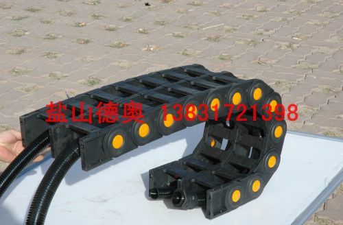 塑料拖链内高、弯曲半径R可有不同的选择。单元链节由左右链板和上下盖板组成,拖链每节都能打开,装拆方便,不必穿线,打开盖板后即可把电缆、油管、气管等放入拖链内。另可提供分隔片,将链内空间按需要分隔开。