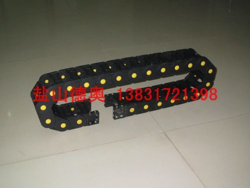 外形似坦克链,由众多单元链节组成,链节之间转动自如。相同系列的拖链内高、外高、节距相同,塑料拖链内高、弯曲半径R可有不同的选择。单元链节由左右链板和上下盖板组成,拖链每节都能打开,装拆方便,不必穿线,打开盖板后即可把电缆、油管、气管等放入拖链内。另可提供分隔片,将链内空间按需要分隔开。
