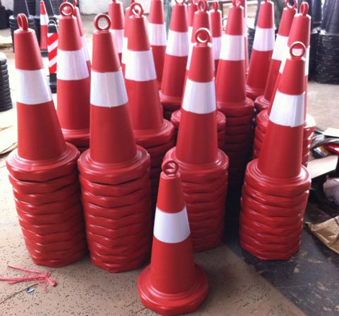 使用硬体的吹塑PE路锥,美式路锥使用软体PVC路锥。