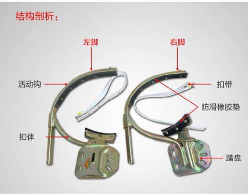 脚扣主要由活动钩、扣体踏盘、顶扣、扣带和防滑橡垫构成。我公司生产的登杆脚扣采用高强孟