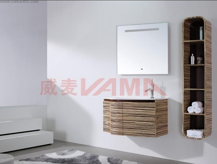 浴室柜制造主材:以纯天然的马来西亚多层实木,以珍稀实木饰面,配以现代色彩,主要采用巴西斑马,美国红橡,印尼