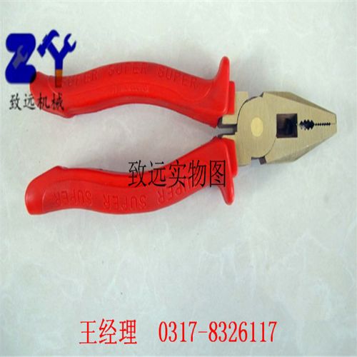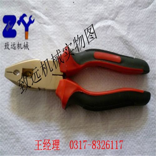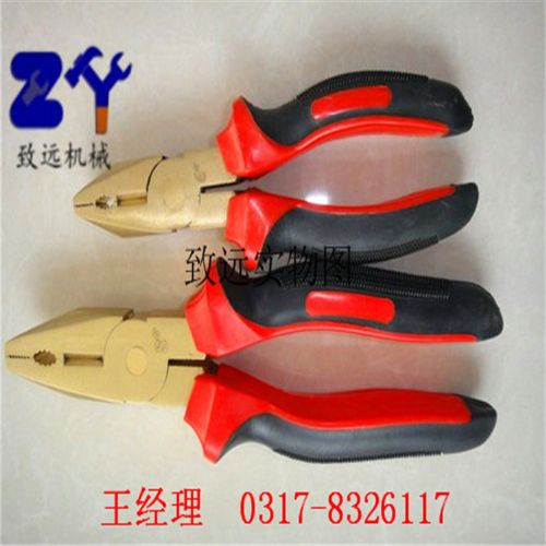 规格:6寸--10寸不等,也可以根据客户要求来加工定做。在使用防爆老虎钳过程中应根据需要合理选择其品种规格,不得以小代大,更不得把它当做使用钢制工具一样来对待,还应指出的是在使用克丝钳时,要注意受力方向的要求,不得任意反向用力,在使用带刃的工具时,首先应测定工件本身的硬度,如其硬度接近克丝钳硬度时,应仔细小心操作,高于工具硬度时则禁止使用。当工件是由机动旋紧的、半**性固定的或因长久锈蚀,而使用
