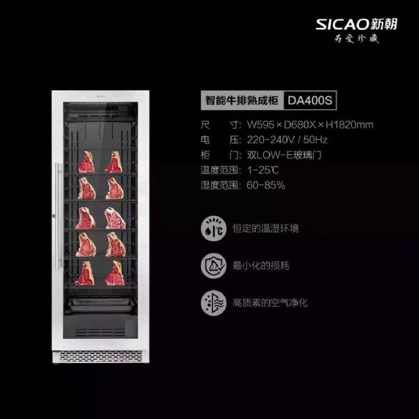 杀菌灯、活性UVC通风消毒等技术,保鲜期更长,牛肉更嫩,提升肉品熟成。同时牛肉的损耗率也相对较低。同比情况下,在熟成4周内,新朝智能牛排熟成柜的牛肉损耗率低于10%。能售卖的干式熟成牛排,都是经历了若干周甚至几个月熟成的等待。时间虽然长,但是你将获得一种充满风味和温柔的令人难以置信的牛排。有人说,不懂干式熟成,如何自称牛排老饕?新朝智能牛排熟成柜,只为真正的挑剔美食客,轻松享有一块米其林招牌牛排熟成柜是在一个恒温恒湿的环境里将牛肉进行排酸12-21天进行干式熟成的过程,牛肉一般熟成到21天为食用的*佳节点这个时期的牛肉口感*佳,这个环境,干式熟成牛肉的诞生是为了满足食客的完美追求。