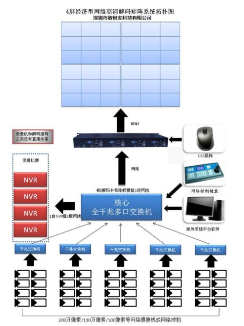 电视墙的部署与管理而设计的解码+拼接上墙的一款高技术含量的矩阵,采用Linux操作系统,运行稳定可靠。支持高清1080P/720P/D1网络视频的解码输出;高清HDMI接口解码输出;支持ONVIF及多种网络传输协议、多码流解码方式,为大中小型拼接电视墙解码切换服务提供强有力的支持。支持1080P/720P高清网络球机的控制,支持报警联动自动切屏功能,支持ip地址冲突检测!