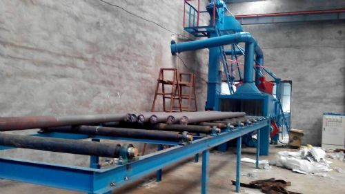 钢材送进清理机室体内抛射区,其周身各面受到来自不同坐标方位的强力密集弹丸打击与磨擦,使之其上的氧化皮、锈层及其污物迅速脱落,钢材表面就获得一定粗糙度的光洁表面,在清理室外两边进出口辊道装卸工件。