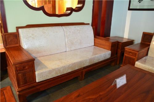 红木家具配上极富意蕴的博古雕饰,将红木家具的雅致表现得淋漓尽致。另外,此沙发在整体的造型设计上结合了现代的风格,