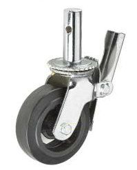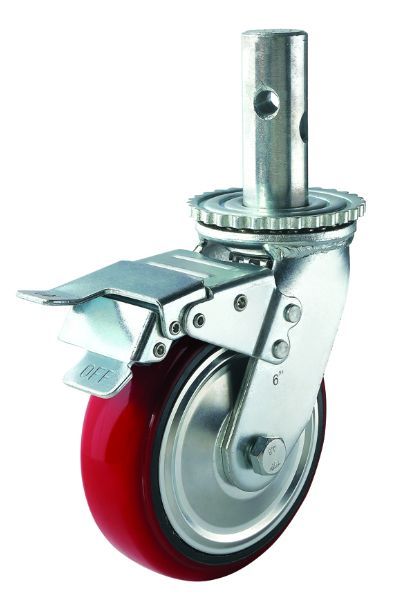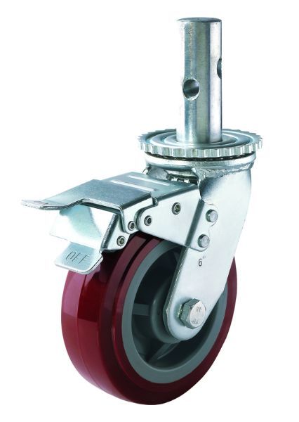3) 美式铁芯PU鹰架轮:轮体PU包铁芯,尺寸6-8寸、载重350-400KG、双滚珠轴承,安装方式:插杆 刹车方式:前顶刹