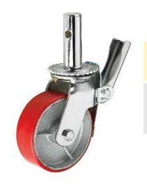 6) 欧式铁芯橡胶鹰架轮:轮体橡胶包铁芯,尺寸6-8寸、载重430-480KG、双滚珠轴承,安装方式:插杆 刹车方式:前顶刹