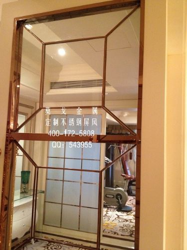 钢板材电镀玫瑰金后镂空而成的屏风,颜色为玫瑰金。