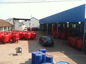 泡沫罐的进水管进入罐内,挤压胶囊,将胶囊中的泡沫液通过泡沫罐的出液管挤压至比例混合器低压处与水混合形成泡沫混合液,形成的泡沫混合液输出到泡沫产生设备(中、低、高倍数泡沫产生器,泡沫枪,泡沫炮等)与空气混合产生泡沫灭火。该装置广泛用于油库、化工厂、机库、油田、燃油