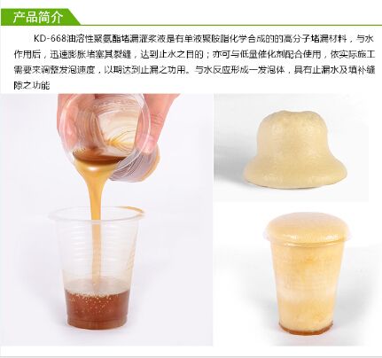 1、疏水性好,遇水后会立即进行聚合反应,分散乳化或发泡膨胀,并与砂石泥土固结成弹性固结体,迅速堵塞裂缝,**性止水。